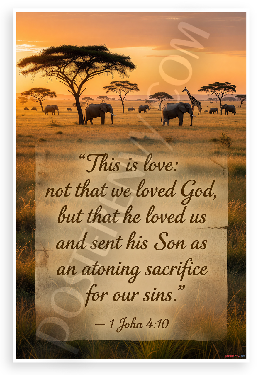 - Premium Print: This PosterEnvy 12x18 inch poster is printed on Durable, Heavy Duty Paper, Designed to last many years with African savanna wildlife scene and 1 John 4:10 Bible verse on God's love