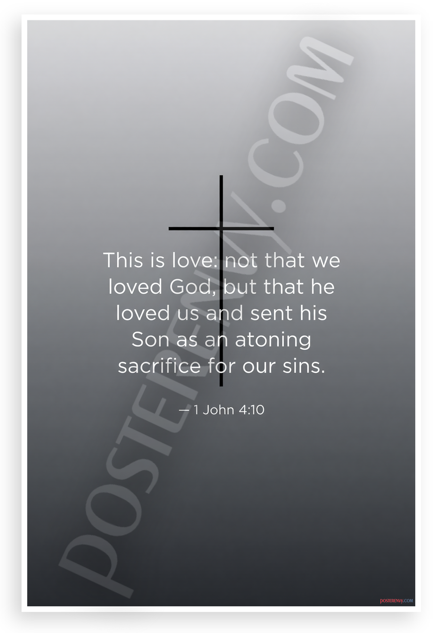 This 12x18 inch poster is printed on premium, durable paper. Proudly Made in the USA by PosterEnvy. The perfect size for any room. PosterEnvy is a family owned business, delivering top-notch posters around the world for over 20 years. Our posters are designed to last — they won't fade or pucker for years of enjoyment. Every poster features crisp, vivid artwork. We are a solar powered company. This minimalist Christian poster centers a bold black cross on a soft gray gradient background with the full Bible verse from 1 John 4:10 in clean white typography, inspiring reflection and faith.
