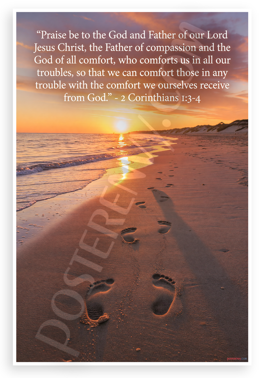 - Premium Print: This PosterEnvy 12x18 inch poster is printed on Durable, Heavy Duty Paper, Designed to last many years with 2 Corinthians 1:3-4 Bible verse, beach footprints sunset scene