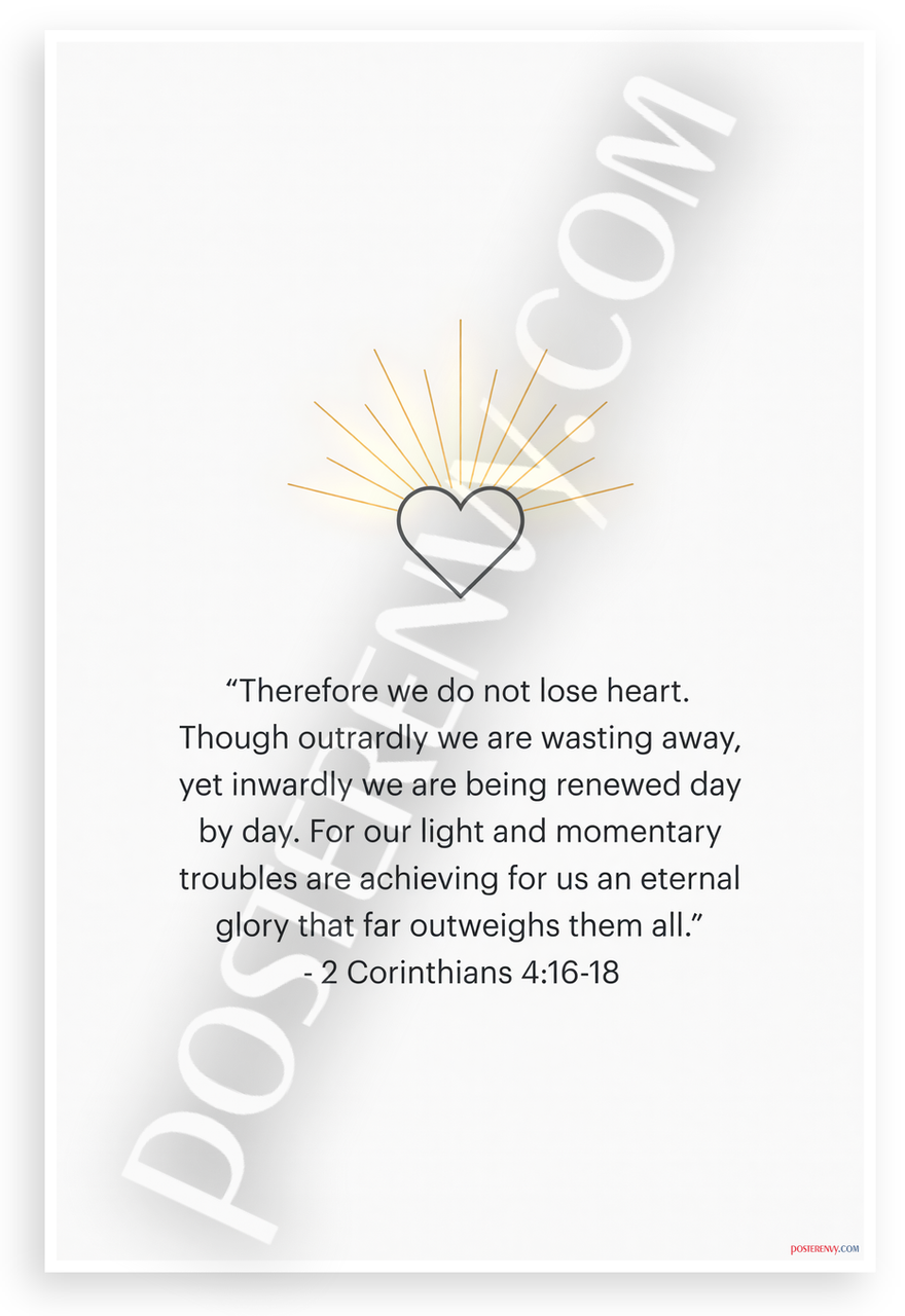 - Premium Print: This PosterEnvy 12x18 inch poster is printed on Durable, Heavy Duty Paper, Designed to last many years with minimalist heart icon, radiant sunburst, and 2 Corinthians 4:16-18 Bible quote