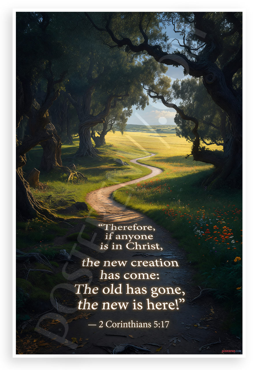 This 12x18 inch poster is printed on premium, durable paper. Proudly Made in the USA by PosterEnvy. The perfect size for any room. PosterEnvy is a family owned business, delivering top-notch posters around the world for over 20 years. Our posters are designed to last — they won't fade or pucker for years of enjoyment. Every poster features crisp, vivid artwork. We are a solar powered company. This inspirational poster depicts a winding path from shadowy ancient trees to a bright yellow-green field with orange flowers, overlaid with the Bible verse from 2 Corinthians 5:17 about new creation in Christ. The serene landscape evokes themes of personal transformation and hope.