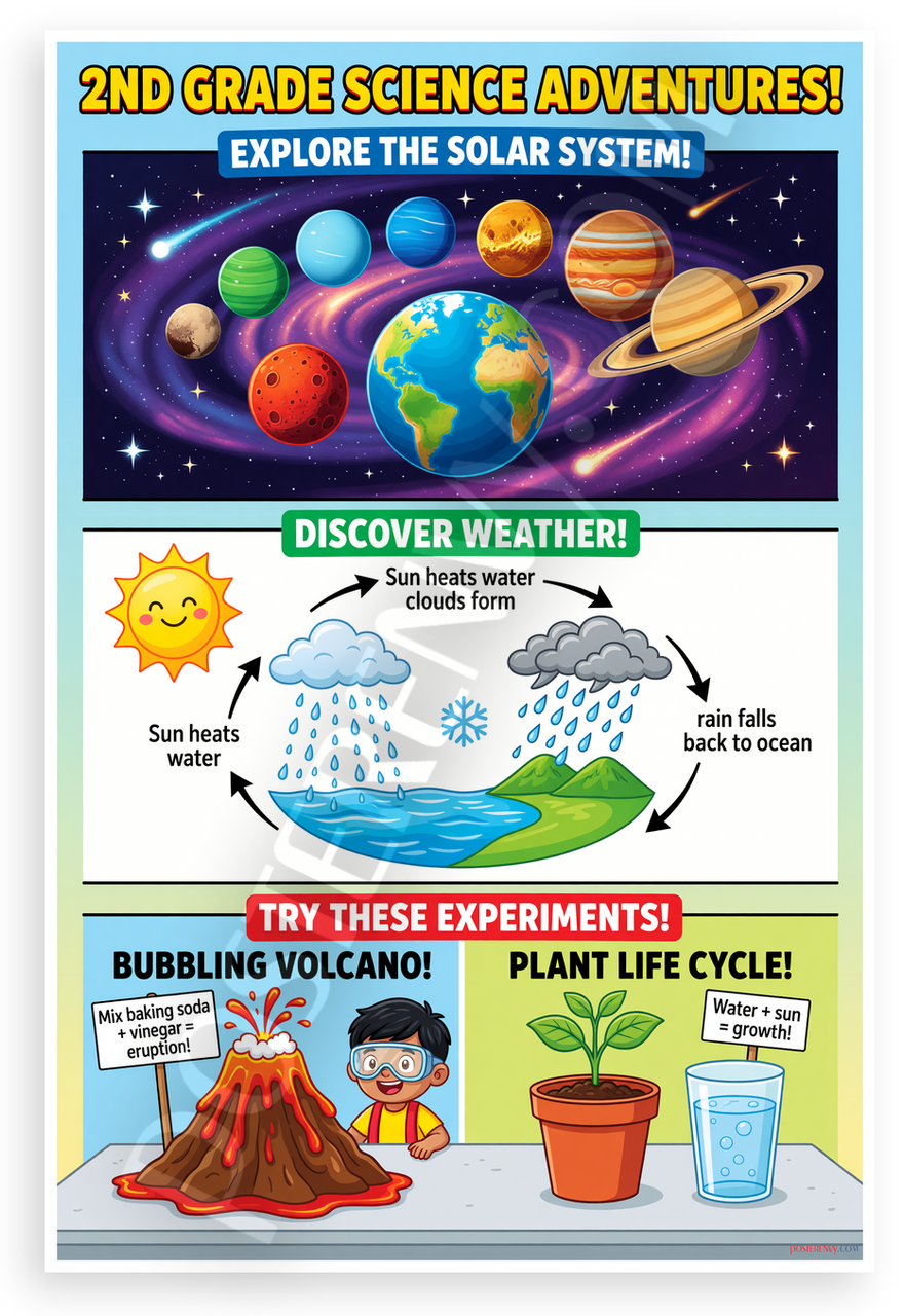 This 12x18 inch poster is printed on premium, durable paper. Proudly Made in the USA by PosterEnvy. The perfect size for any room. PosterEnvy is a family owned business, delivering top-notch posters around the world for over 20 years. Our posters are designed to last — they won't fade or pucker for years of enjoyment. Every poster features crisp, vivid artwork. We are a solar powered company. This vibrant educational poster covers 2nd grade science topics including the solar system with planets and Earth, the water cycle with sun evaporation clouds rain and snow, and fun experiments like baking soda vinegar volcano and plant life cycle with water and sun. Ideal for young learners sparking curiosity in science.