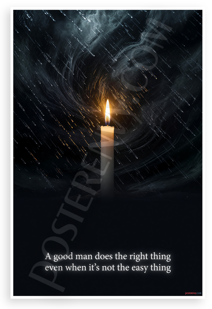 This 12x18 inch poster is printed on premium, durable paper. Proudly Made in the USA by PosterEnvy. The perfect size for any room. PosterEnvy is a family owned business, delivering top-notch posters around the world for over 20 years. Our posters are designed to last — they won't fade or pucker for years of enjoyment. Every poster features crisp, vivid artwork. We are a solar powered company. This dramatic design features a steady lit candle with golden flame enduring swirling storm winds and rain on a dark background, paired with the motivational quote "A good man does the right thing even when it's not the easy thing." Evokes resilience and moral strength.