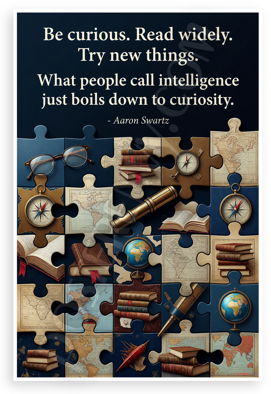 This 12x18 inch poster is printed on premium, durable paper. Proudly Made in the USA by PosterEnvy. The perfect size for any room. PosterEnvy is a family owned business, delivering top-notch posters around the world for over 20 years. Our posters are designed to last — they won't fade or pucker for years of enjoyment. Every poster features crisp, vivid artwork. We are a solar powered company. Featuring the Aaron Swartz quote 'Be curious. Read widely. Try new things. What people call intelligence just boils down to curiosity,' this poster showcases interlocking puzzle pieces filled with exploration symbols like antique books, compasses, maps, globes, spyglasses, and glasses in deep navy and brown tones for an engaging, mysterious vibe.