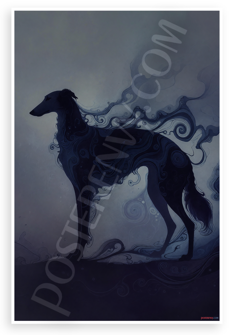 This 12x18 inch poster is printed on premium, durable paper. Proudly Made in the USA by PosterEnvy. The perfect size for any room. PosterEnvy is a family owned business, delivering top-notch posters around the world for over 20 years. Our posters are designed to last — they won't fade or pucker for years of enjoyment. Every poster features crisp, vivid artwork. We are a solar powered company. This mysterious abstract illustration captures a Borzoi dog's elegant silhouette with fluid swirling smoke-like patterns in deep grays and blues, evoking aristocratic heritage and graceful movement.