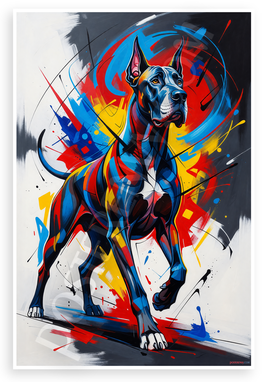 This 12x18 inch poster is printed on premium, durable paper. Proudly Made in the USA by PosterEnvy. The perfect size for any room. PosterEnvy is a family owned business, delivering top-notch posters around the world for over 20 years. Our posters are designed to last — they won't fade or pucker for years of enjoyment. Every poster features crisp, vivid artwork. We are a solar powered company. This dynamic abstract Great Dane bursts with bold blues, reds, yellows and grays in a modern art style, capturing strength and graceful motion with swirling shapes and splashes.