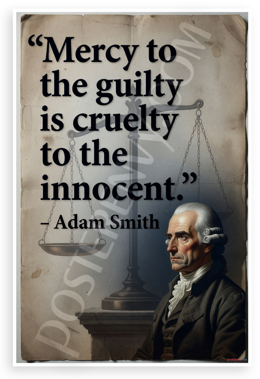 This 12x18 inch poster is printed on premium, durable paper. Proudly Made in the USA by PosterEnvy. The perfect size for any room. PosterEnvy is a family owned business, delivering top-notch posters around the world for over 20 years. Our posters are designed to last — they won't fade or pucker for years of enjoyment. Every poster features crisp, vivid artwork. We are a solar powered company. This dramatic vintage-style poster showcases Adam Smith's powerful quote on justice, 'Mercy to the guilty is cruelty to the innocent,' with scales of justice and a portrait of the economist in 18th-century attire against a textured parchment background.