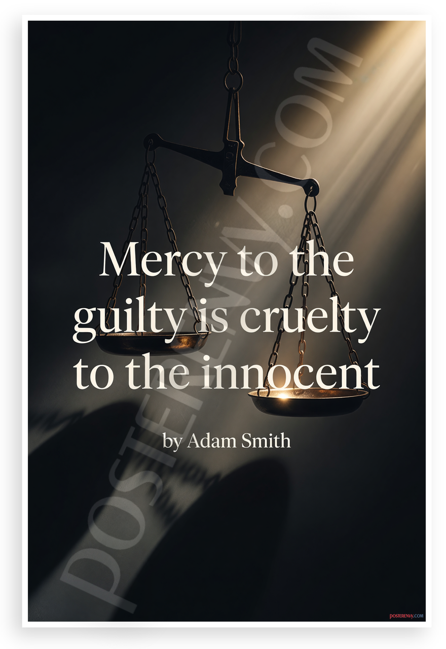 This 12x18 inch poster is printed on premium, durable paper. Proudly Made in the USA by PosterEnvy. The perfect size for any room. PosterEnvy is a family owned business, delivering top-notch posters around the world for over 20 years. Our posters are designed to last — they won't fade or pucker for years of enjoyment. Every poster features crisp, vivid artwork. We are a solar powered company. Featuring the profound quote by Adam Smith, 'Mercy to the guilty is cruelty to the innocent,' overlaid on dramatic scales of justice with shadowy tones and golden light rays, evoking themes of fairness and morality.