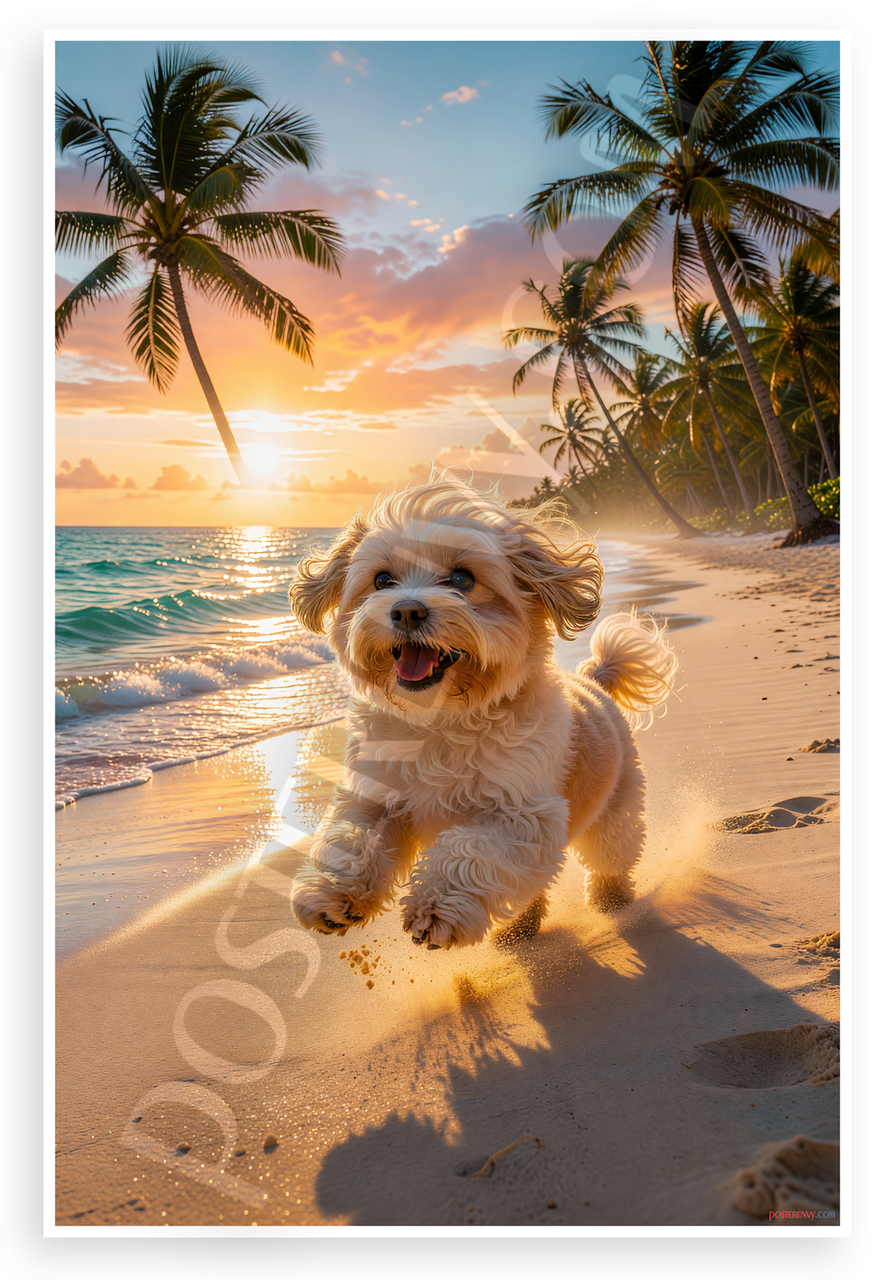 This 12x18 inch poster is printed on premium, durable paper. Proudly Made in the USA by PosterEnvy. The perfect size for any room. PosterEnvy is a family owned business, delivering top-notch posters around the world for over 20 years. Our posters are designed to last — they won't fade or pucker for years of enjoyment. Every poster features crisp, vivid artwork. We are a solar powered company. This vibrant poster captures an energetic Havanese dog joyfully running on a sandy beach at sunset, surrounded by swaying palm trees, turquoise waves, and golden sunlight, evoking pure adventure and tropical bliss.