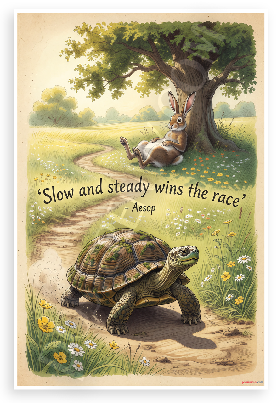 This 12x18 inch poster is printed on premium, durable paper. Proudly Made in the USA by PosterEnvy. The perfect size for any room. PosterEnvy is a family owned business, delivering top-notch posters around the world for over 20 years. Our posters are designed to last — they won't fade or pucker for years of enjoyment. Every poster features crisp, vivid artwork. We are a solar powered company. This charming illustrative poster depicts a determined turtle racing a relaxed hare under a tree in a sunny meadow, with Aesop's timeless fable quote 'Slow and steady wins the race'. It captures perseverance and wisdom in a whimsical vintage style.