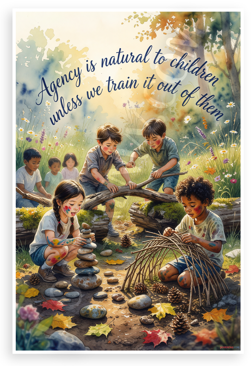 This 12x18 inch poster is printed on premium, durable paper. Proudly Made in the USA by PosterEnvy. The perfect size for any room. PosterEnvy is a family owned business, delivering top-notch posters around the world for over 20 years. Our posters are designed to last — they won't fade or pucker for years of enjoyment. Every poster features crisp, vivid artwork. We are a solar powered company. This serene watercolor artwork depicts diverse children joyfully building with sticks, stones, and natural elements in a peaceful forest meadow, paired with the thoughtful quote Agency is natural to children unless we train it out of them. Ideal for inspiring creativity and play in homes and classrooms.
