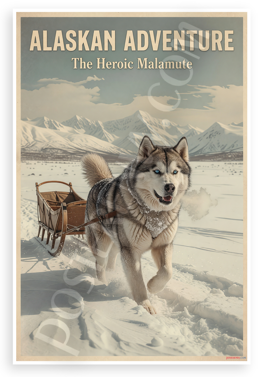 This 12x18 inch poster is printed on premium, durable paper. Proudly Made in the USA by PosterEnvy. The perfect size for any room. PosterEnvy is a family owned business, delivering top-notch posters around the world for over 20 years. Our posters are designed to last — they won't fade or pucker for years of enjoyment. Every poster features crisp, vivid artwork. We are a solar powered company. This vintage-style poster captures a heroic Alaskan Malamute pulling a wooden sled through snowy Alaskan mountains, evoking adventure and nostalgia with muted tones and dramatic winter scenery.