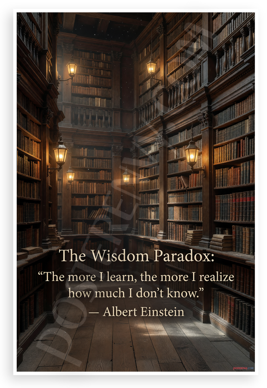 This 12x18 inch poster is printed on premium, durable paper. Proudly Made in the USA by PosterEnvy. The perfect size for any room. PosterEnvy is a family owned business, delivering top-notch posters around the world for over 20 years. Our posters are designed to last — they won't fade or pucker for years of enjoyment. Every poster features crisp, vivid artwork. We are a solar powered company. This stunning poster depicts a grand aged library with towering wooden bookshelves, warm lantern glow, and ornate architecture, overlaid with the profound Albert Einstein quote 'The more I learn, the more I realize how much I don't know' under the title 'The Wisdom Paradox'. Ideal for inspiring curiosity and reflection.