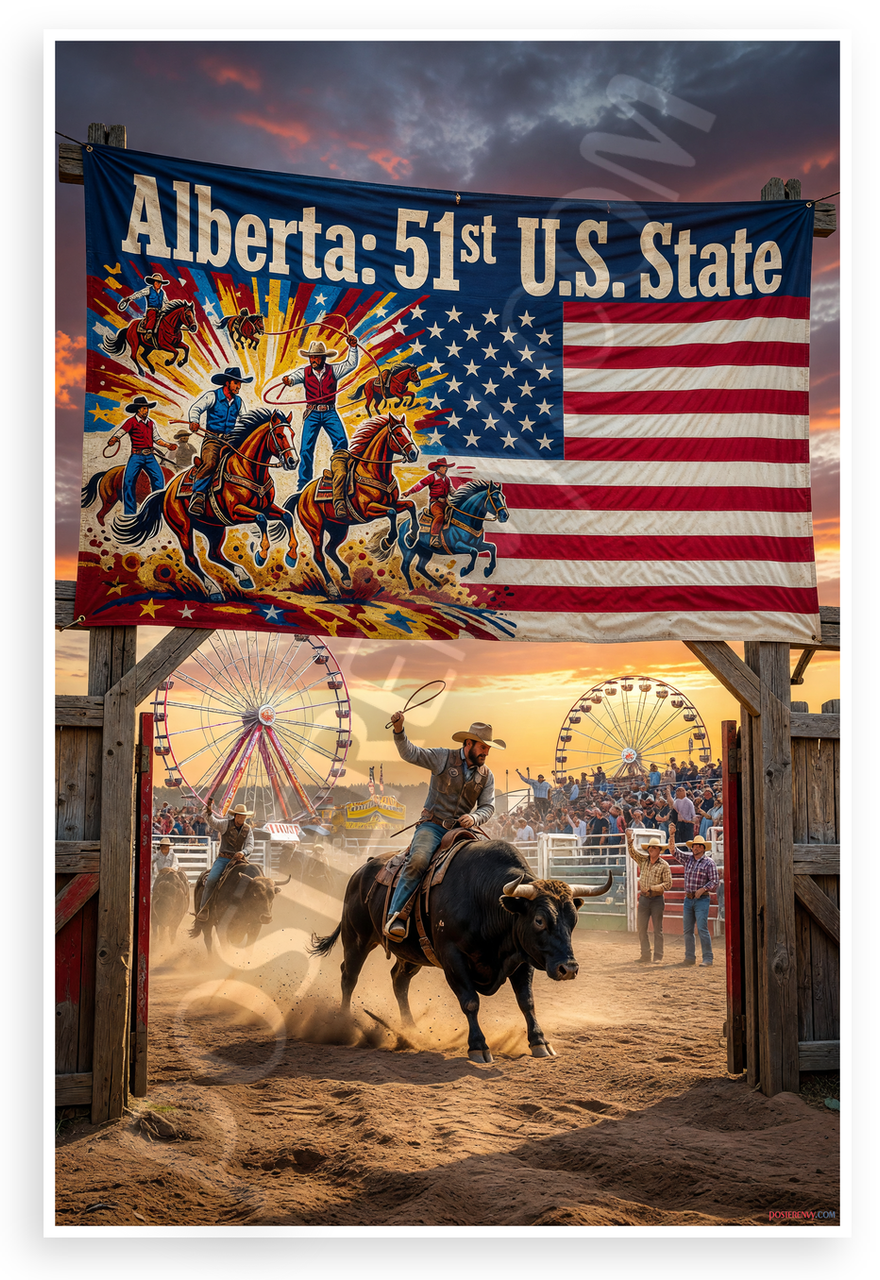 - Satirical Rodeo Fusion: Vibrant retro-style depiction of bull riding at Calgary Stampede under Alberta 51st US State banner with stars stripes flag sunset mood ideal for man cave bar game room