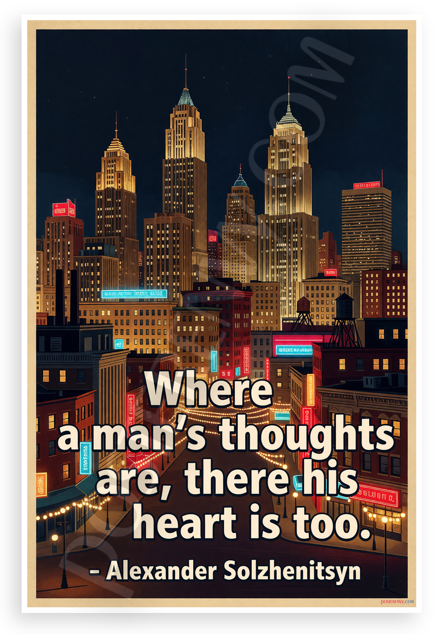 This 12x18 inch poster is printed on premium, durable paper. Proudly Made in the USA by PosterEnvy. The perfect size for any room. PosterEnvy is a family owned business, delivering top-notch posters around the world for over 20 years. Our posters are designed to last — they won't fade or pucker for years of enjoyment. Every poster features crisp, vivid artwork. We are a solar powered company. This vibrant vintage-style poster showcases a glowing nighttime city skyline with neon lights and towering skyscrapers, overlaid with the profound Alexander Solzhenitsyn quote "Where a man's thoughts are, there his heart is too." Ideal for adding an uplifting, philosophical touch to any space.