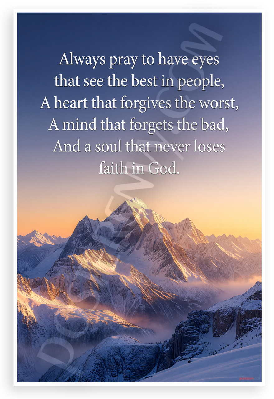 This 12x18 inch poster is printed on premium, durable paper. Proudly Made in the USA by PosterEnvy. The perfect size for any room. PosterEnvy is a family owned business, delivering top-notch posters around the world for over 20 years. Our posters are designed to last — they won't fade or pucker for years of enjoyment. Every poster features crisp, vivid artwork. We are a solar powered company. This inspirational poster showcases a majestic snow-capped mountain range at dawn with glowing orange and blue skies, overlaid with a powerful faith-based quote encouraging seeing the best in others and never losing faith in God.