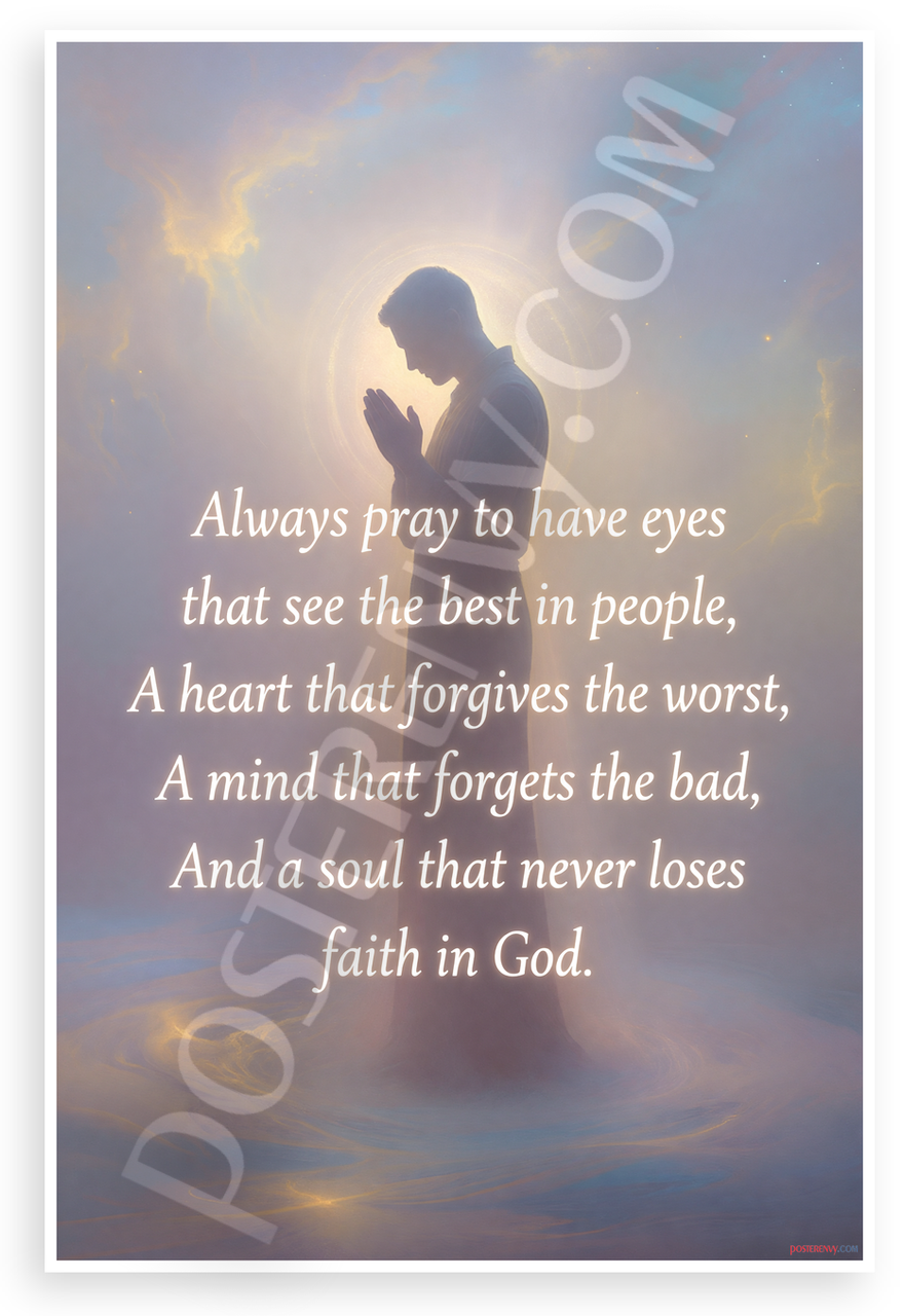 This 12x18 inch poster is printed on premium, durable paper. Proudly Made in the USA by PosterEnvy. The perfect size for any room. PosterEnvy is a family owned business, delivering top-notch posters around the world for over 20 years. Our posters are designed to last — they won't fade or pucker for years of enjoyment. Every poster features crisp, vivid artwork. We are a solar powered company. This spiritual poster features a silhouetted figure in prayer amid an ethereal glow of clouds and golden light, overlaid with an uplifting quote about seeing the best in people, forgiveness, forgetting negativity, and unwavering faith in God. Ideal for creating a serene, faith-filled atmosphere.