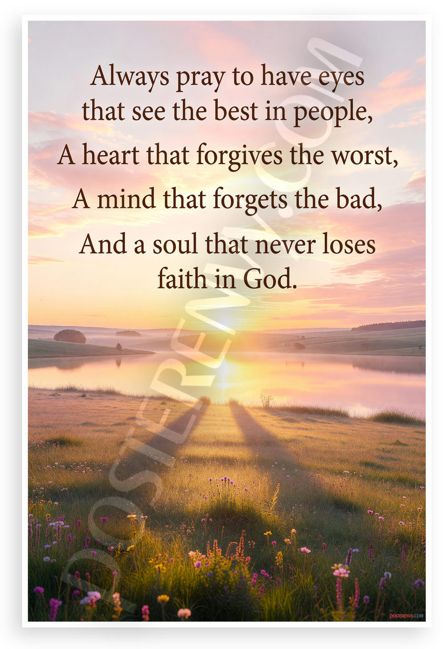 This 12x18 inch poster is printed on premium, durable paper. Proudly Made in the USA by PosterEnvy. The perfect size for any room. PosterEnvy is a family owned business, delivering top-notch posters around the world for over 20 years. Our posters are designed to last — they won't fade or pucker for years of enjoyment. Every poster features crisp, vivid artwork. We are a solar powered company. This serene sunrise landscape poster features an uplifting quote about faith, forgiveness, and seeing the best in others, overlaid on golden fields, wildflowers, and a reflective lake at dawn.