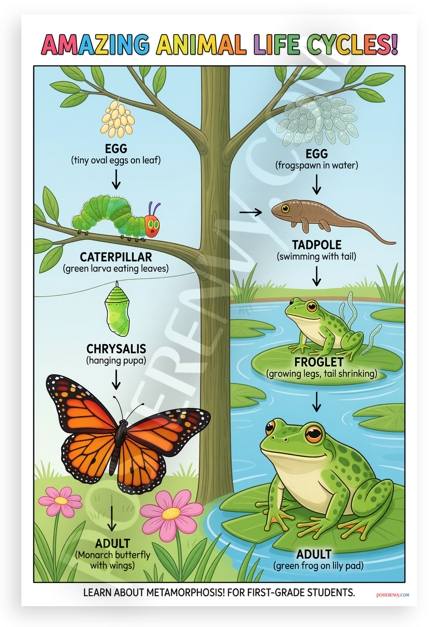This 12x18 inch poster is printed on premium, durable paper. Proudly Made in the USA by PosterEnvy. The perfect size for any room. PosterEnvy is a family owned business, delivering top-notch posters around the world for over 20 years. Our posters are designed to last — they won't fade or pucker for years of enjoyment. Every poster features crisp, vivid artwork. We are a solar powered company. This vibrant educational poster illustrates the complete life cycles of a monarch butterfly and green frog, from egg to adult, with labeled stages like caterpillar, chrysalis, tadpole, and froglet. Ideal for first-grade science lessons on metamorphosis.
