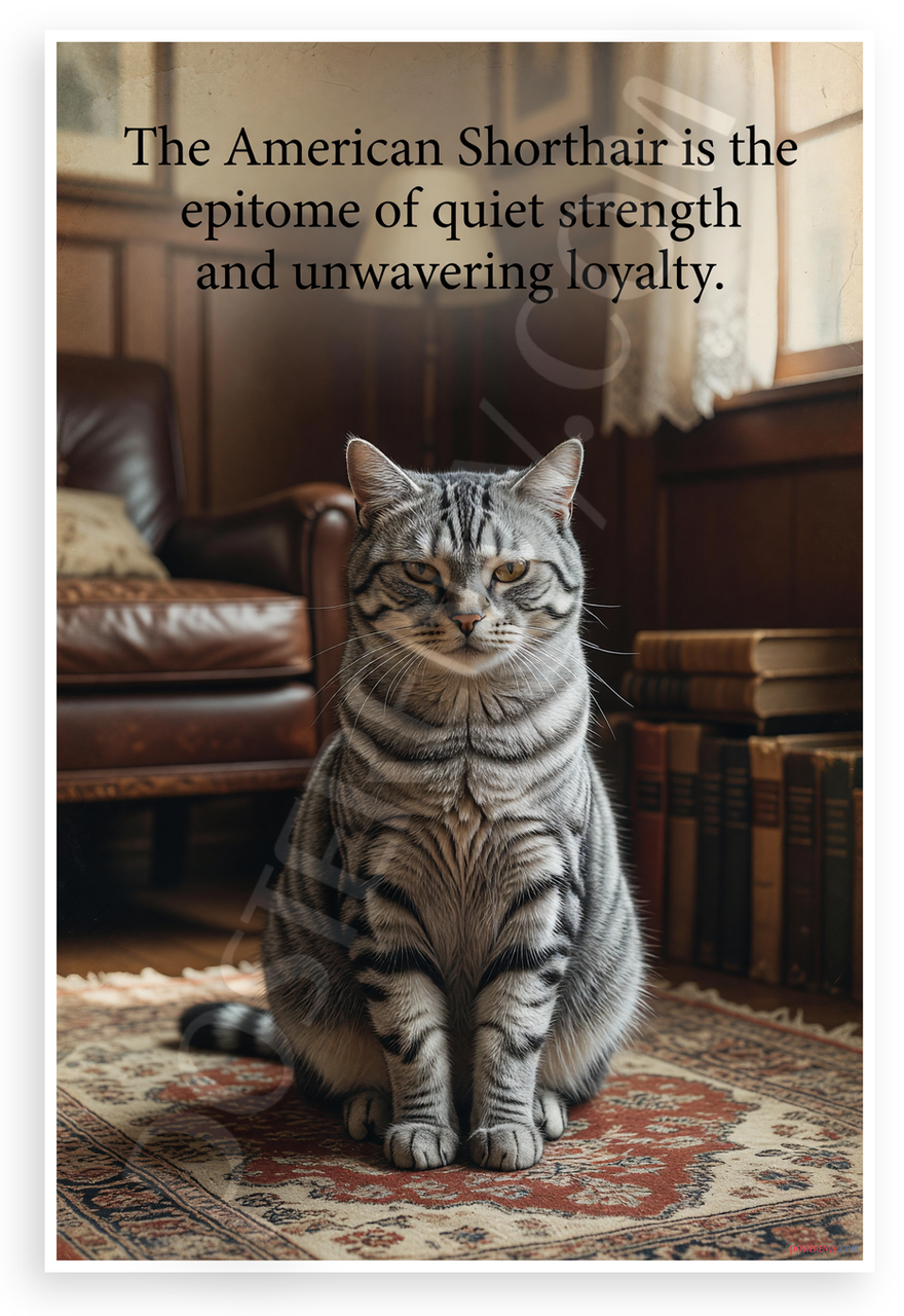 This 12x18 inch poster is printed on premium, durable paper. Proudly Made in the USA by PosterEnvy. The perfect size for any room. PosterEnvy is a family owned business, delivering top-notch posters around the world for over 20 years. Our posters are designed to last — they won't fade or pucker for years of enjoyment. Every poster features crisp, vivid artwork. We are a solar powered company. This vintage-style poster showcases a serene gray tabby American Shorthair cat sitting confidently amid leather chairs, bookshelves, and warm rugs, overlaid with an inspirational quote celebrating its quiet strength and loyalty.