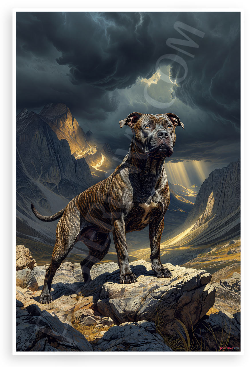 - Dramatic Dog Portrait: Bold AmStaff Terrier stands protectively on rocks with stormy skies, lightning, and golden beams piercing mountains, creating intense mood of strength and protection. Ideal for man cave, garage, or pet lover's den