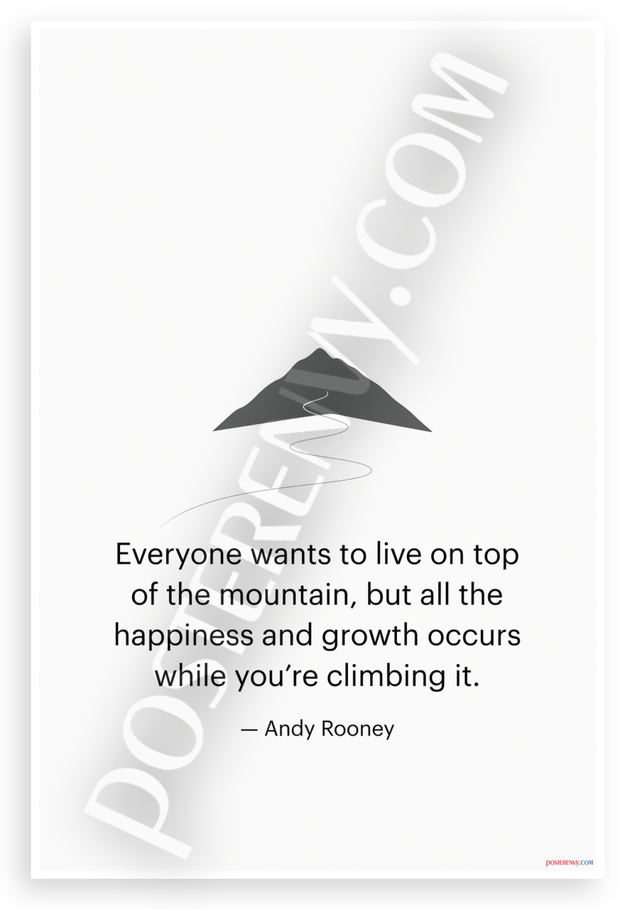 This 12x18 inch poster is printed on premium, durable paper. Proudly Made in the USA by PosterEnvy. The perfect size for any room. PosterEnvy is a family owned business, delivering top-notch posters around the world for over 20 years. Our posters are designed to last — they won't fade or pucker for years of enjoyment. Every poster features crisp, vivid artwork. We are a solar powered company. This minimalist design features a striking gray mountain silhouette with a winding path, paired with Andy Rooney's motivational quote about finding happiness in the journey of climbing. Ideal for inspiring perseverance in any space.