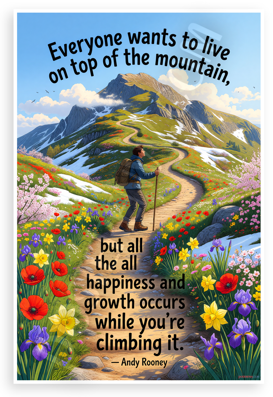- Premium Print: This PosterEnvy 12x18 inch poster is printed on Durable, Heavy Duty Paper, Designed to last many years featuring Andy Rooney mountain climbing quote with vibrant spring flowers trail