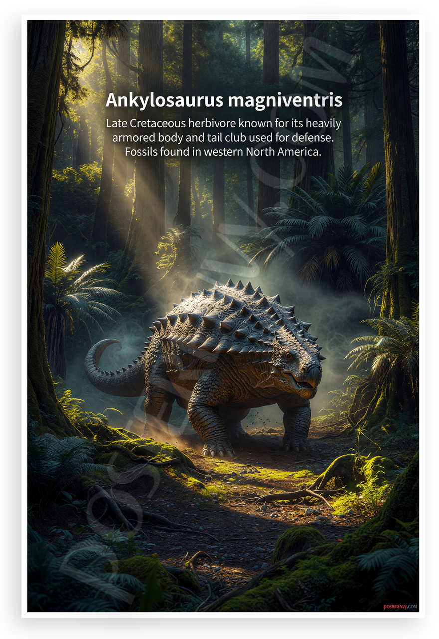 - Solar Powered Production: All our posters are designed and printed using solar energy, with crisp vivid artwork. Dramatic lighting, misty forest scene, educational text on Ankylosaurus magniventris herbivore.
