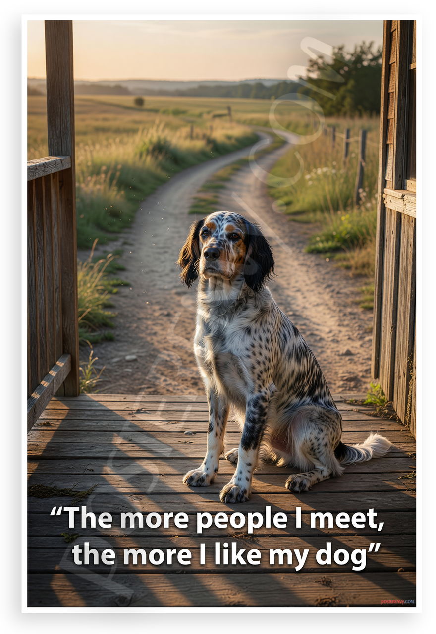 This 12x18 inch poster is printed on premium, durable paper. Proudly Made in the USA by PosterEnvy. The perfect size for any room. PosterEnvy is a family owned business, delivering top-notch posters around the world for over 20 years. Our posters are designed to last — they won't fade or pucker for years of enjoyment. Every poster features crisp, vivid artwork. We are a solar powered company. This charming poster showcases a loyal English Setter sitting on a wooden porch overlooking a golden hour rural landscape with winding dirt road and fields. Paired with the humorous quote 'The more people I meet, the more I like my dog' attributed to Anonymous, it captures a warm, comforting mood perfect for dog enthusiasts.