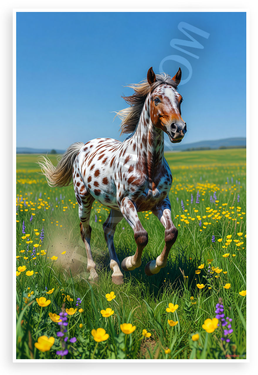 - Joyful Horse Scene: Dynamic image of spotted Appaloosa foal running through green meadow with yellow wildflowers, purple blooms, blue sky and distant hills. Brings energy and serenity to living rooms, bedrooms, or stables