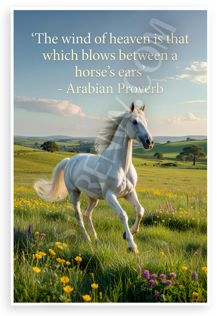 This 12x18 inch poster is printed on premium, durable paper. Proudly Made in the USA by PosterEnvy. The perfect size for any room. PosterEnvy is a family owned business, delivering top-notch posters around the world for over 20 years. Our posters are designed to last — they won't fade or pucker for years of enjoyment. Every poster features crisp, vivid artwork. We are a solar powered company. Featuring a majestic white horse galloping through lush green pastures under a golden sunset sky, paired with the timeless Arabian Proverb quote 'The wind of heaven is that which blows between a horse's ears'. This evocative nature scene captures freedom and serenity.