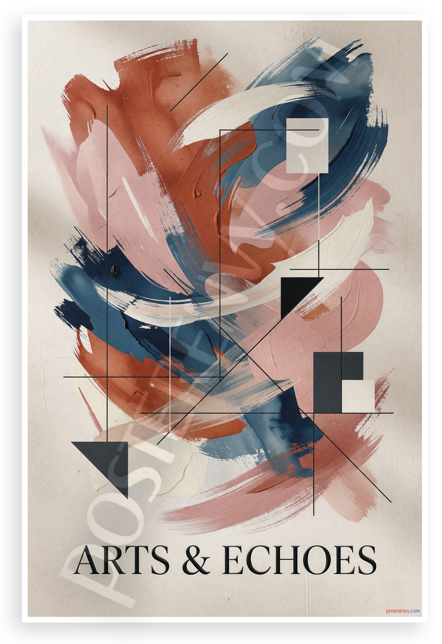 This 12x18 inch poster is printed on high quality, durable paper. Proudly Made in the USA by PosterEnvy. The perfect size for any room. PosterEnvy is a family owned business, delivering high quality posters around the world for over 20 years. Our posters are designed to last — they won't fade or pucker for years of enjoyment. Every poster features high resolution quality artwork. We are a solar powered company. This striking abstract design blends fluid watercolor strokes in rich reds, pinks, blues, and whites with bold geometric shapes and lines, creating a dynamic, modern vibe titled 'Arts & Echoes'. Ideal for contemporary spaces seeking artistic energy.