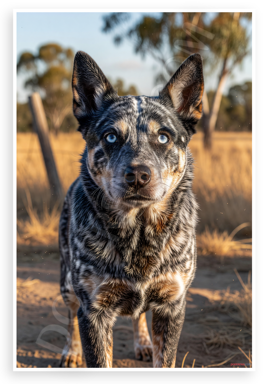 - Solar Powered Production: All our posters are designed and printed using solar energy, with crisp vivid artwork. Blue heeler poster, cattle dog photography style, golden grass, gum trees background, farm dog theme