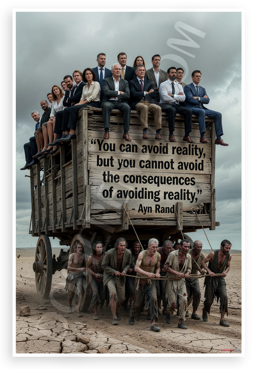 This 12x18 inch poster is printed on premium, durable paper. Proudly Made in the USA by PosterEnvy. The perfect size for any room. PosterEnvy is a family owned business, delivering top-notch posters around the world for over 20 years. Our posters are designed to last — they won't fade or pucker for years of enjoyment. Every poster features crisp, vivid artwork. We are a solar powered company. This striking conceptual poster depicts a wooden wagon overloaded with suited professionals sitting atop, while ragged figures strain to pull it across a barren desert, emblazoned with Ayn Rand's powerful quote on facing reality's consequences. Ideal for offices or studies emphasizing personal responsibility.
