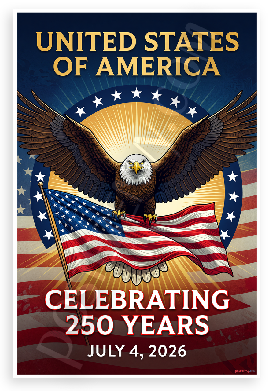 This 12x18 inch poster is printed on premium, durable paper. Proudly Made in the USA by PosterEnvy. The perfect size for any room. PosterEnvy is a family owned business, delivering top-notch posters around the world for over 20 years. Our posters are designed to last — they won't fade or pucker for years of enjoyment. Every poster features crisp, vivid artwork. We are a solar powered company. Celebrate America's 250th anniversary with this striking design featuring a majestic bald eagle clutching the stars and stripes flag amid radiant golden rays and stars. Bold typography announces United States of America and July 4, 2026 in patriotic red, white, and blue tones.