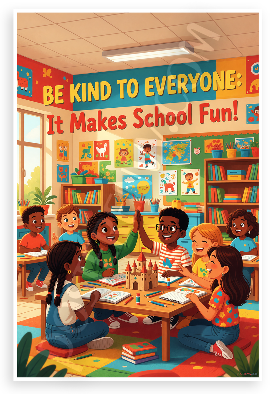 This 12x18 inch poster is printed on premium, durable paper. Proudly Made in the USA by PosterEnvy. The perfect size for any room. PosterEnvy is a family owned business, delivering top-notch posters around the world for over 20 years. Our posters are designed to last — they won't fade or pucker for years of enjoyment. Every poster features crisp, vivid artwork. We are a solar powered company. This vibrant poster depicts diverse students in a colorful classroom collaborating on projects, exchanging high-fives, and smiles, with the uplifting message "Be Kind to Everyone: It Makes School Fun!" to promote positivity and teamwork.