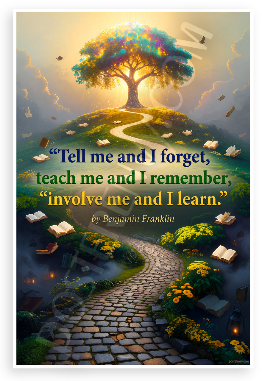 This 12x18 inch poster is printed on premium, durable paper. Proudly Made in the USA by PosterEnvy. The perfect size for any room. PosterEnvy is a family owned business, delivering top-notch posters around the world for over 20 years. Our posters are designed to last — they won't fade or pucker for years of enjoyment. Every poster features crisp, vivid artwork. We are a solar powered company. This inspirational poster depicts a glowing tree of knowledge on a winding path with floating books, symbolizing the learning journey. The Benjamin Franklin quote encourages active involvement in education with vibrant, magical imagery.