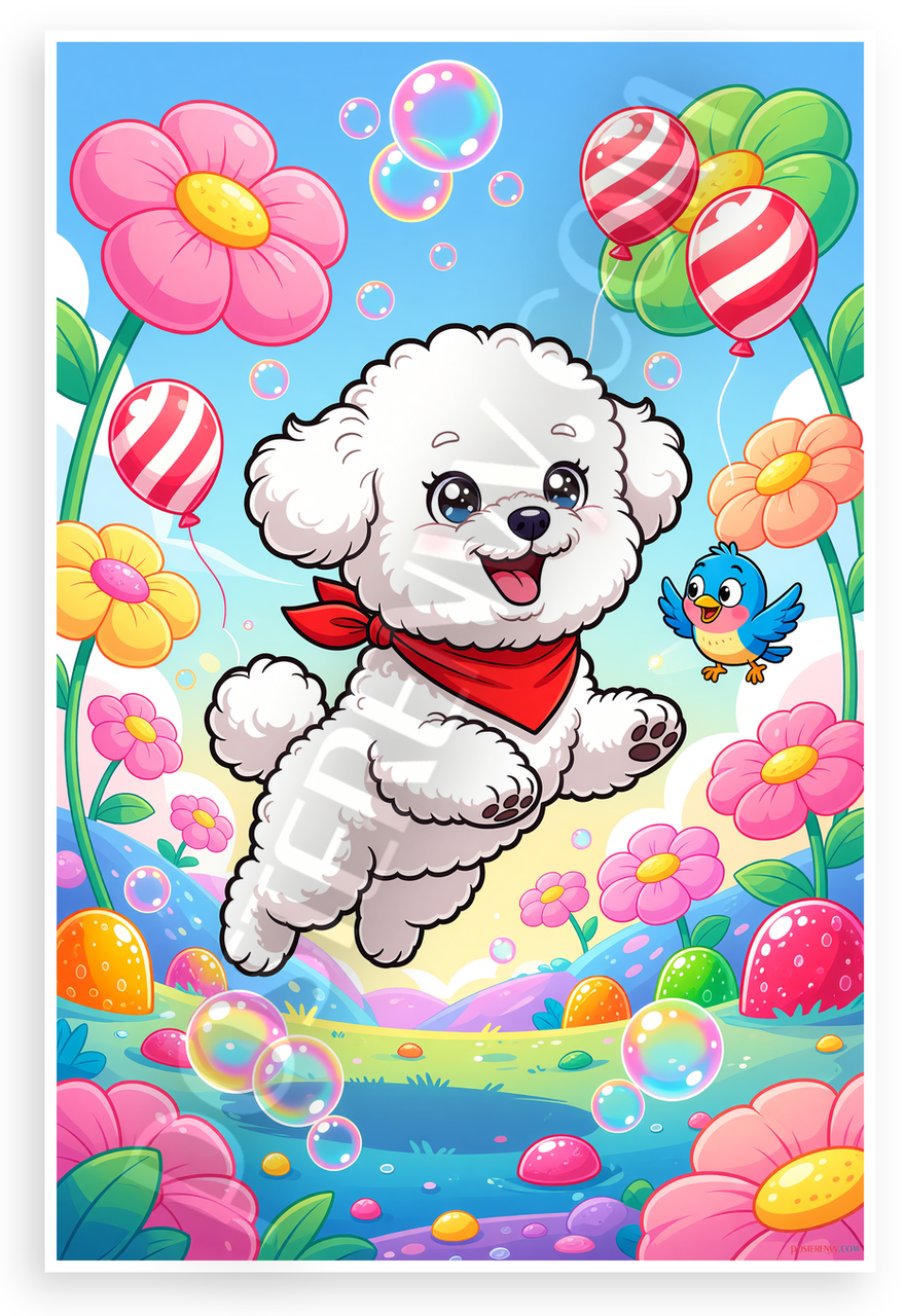 - Whimsical Cartoon Adventure: Vibrant kawaii-style illustration of energetic Bichon Frise puppy jumping happily amid pink flowers, candy balloons, soap bubbles, and a blue bird in a magical garden. Playful mood perfect for nurseries, kids bedrooms, playrooms, or pet-themed spaces