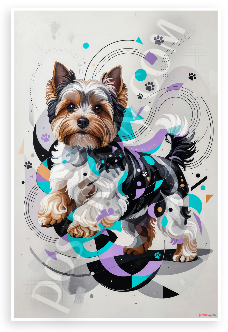 - Whimsical Dog Design: Playful abstract Biewer Terrier portrait with swirling shapes, triangles, circles, and paw prints in dreamy cyan, purple, black palette. Elevates pet-themed rooms with modern artistic energy.