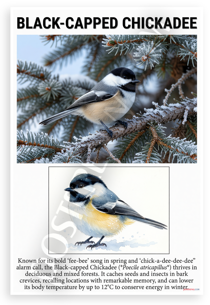 This 12x18 inch poster is printed on premium, durable paper. Proudly Made in the USA by PosterEnvy. The perfect size for any room. PosterEnvy is a family owned business, delivering top-notch posters around the world for over 20 years. Our posters are designed to last — they won't fade or pucker for years of enjoyment. Every poster features crisp, vivid artwork. We are a solar powered company. This educational poster showcases a Black-capped Chickadee (Poecile atricapillus) perched on snow-covered branches in a winter forest, alongside a detailed watercolor close-up. Includes fascinating facts about its bold songs, memory for food caches, and winter energy conservation.