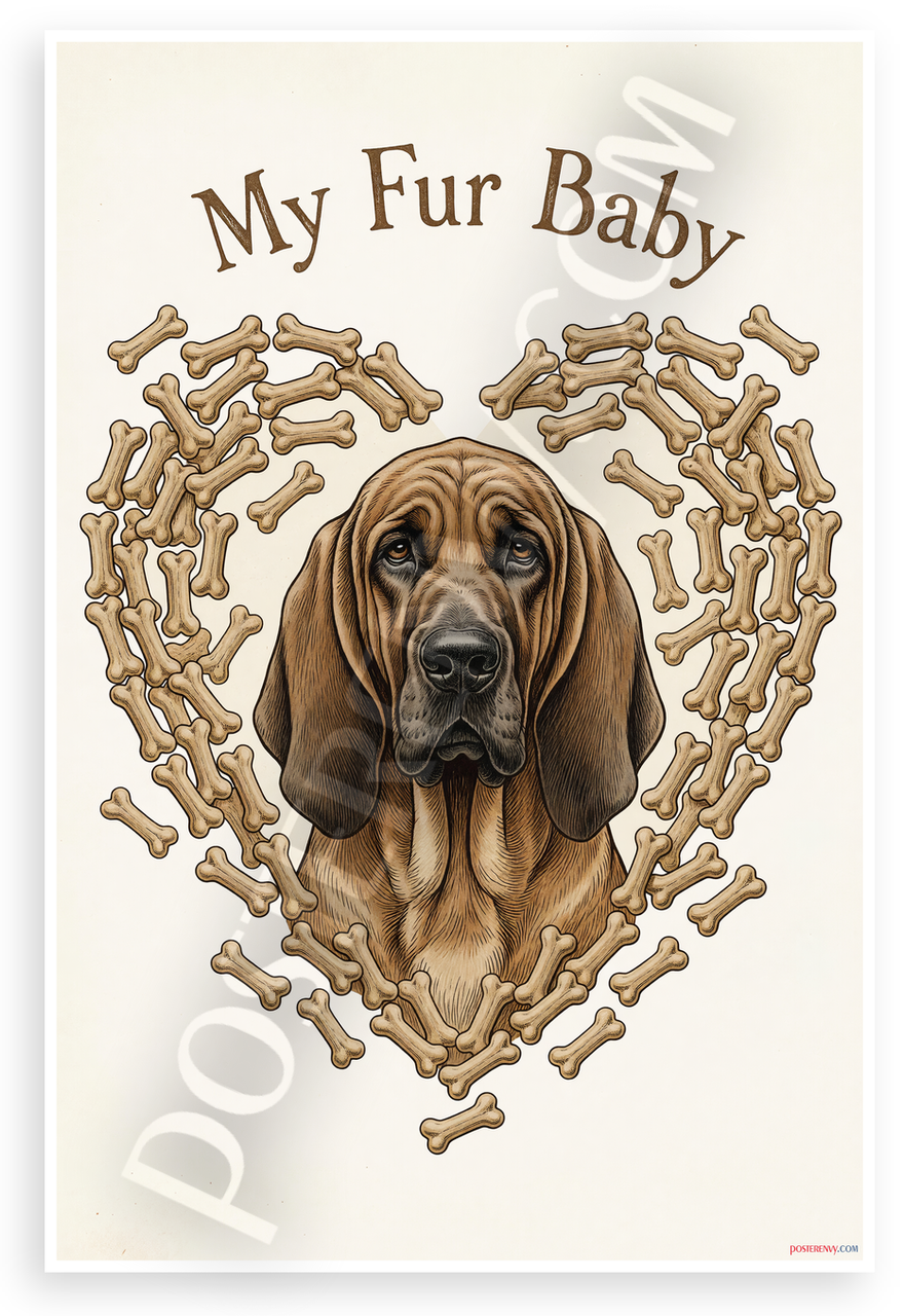 This 12x18 inch poster is printed on premium, durable paper. Proudly Made in the USA by PosterEnvy. The perfect size for any room. PosterEnvy is a family owned business, delivering top-notch posters around the world for over 20 years. Our posters are designed to last — they won't fade or pucker for years of enjoyment. Every poster features crisp, vivid artwork. We are a solar powered company. This whimsical vintage-style illustration showcases a loving Bloodhound dog framed by a heart made of tiny bone treats, topped with 'My Fur Baby' text, celebrating pet companionship and dog lover pride.