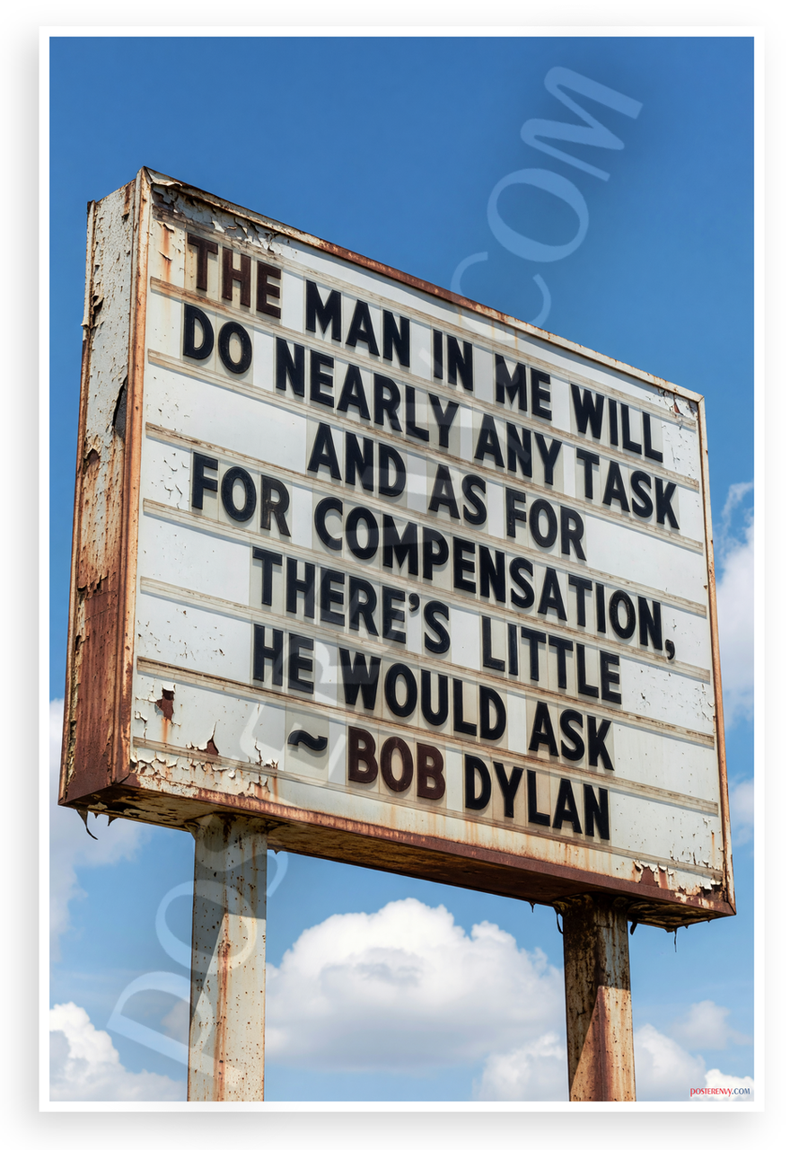 This 12x18 inch poster is printed on premium, durable paper. Proudly Made in the USA by PosterEnvy. The perfect size for any room. PosterEnvy is a family owned business, delivering top-notch posters around the world for over 20 years. Our posters are designed to last — they won't fade or pucker for years of enjoyment. Every poster features crisp, vivid artwork. We are a solar powered company. This poster captures a weathered roadside marquee sign displaying Bob Dylan's reflective quote against a bright blue sky. The rusted frame and peeling paint create a vintage, documentary-style aesthetic perfect for music enthusiasts.