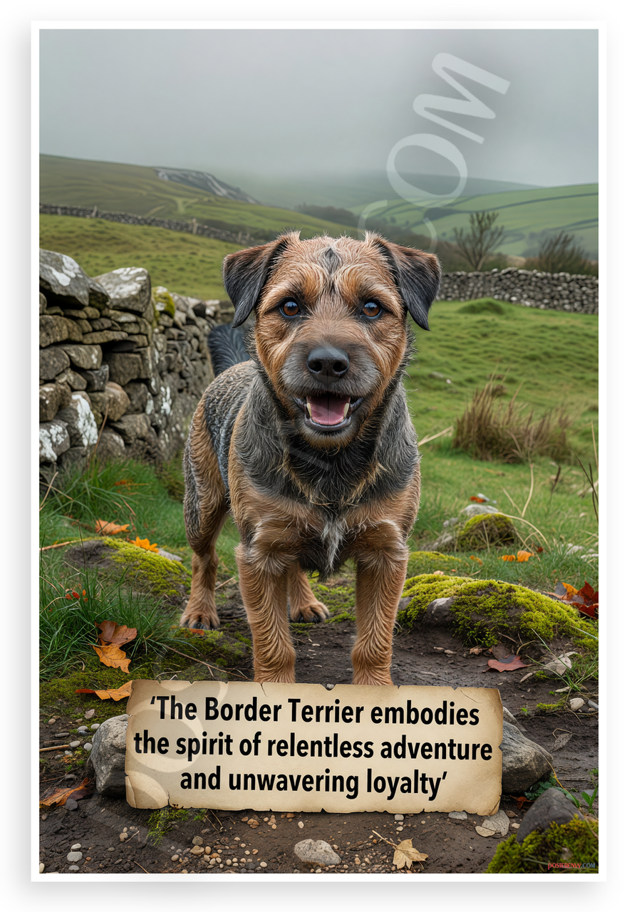 This 12x18 inch poster is printed on premium, durable paper. Proudly Made in the USA by PosterEnvy. The perfect size for any room. PosterEnvy is a family owned business, delivering top-notch posters around the world for over 20 years. Our posters are designed to last — they won't fade or pucker for years of enjoyment. Every poster features crisp, vivid artwork. We are a solar powered company. Featuring a proud Border Terrier standing amidst rustic stone walls, misty green hills, and autumn foliage, with the empowering quote 'The Border Terrier embodies the spirit of relentless adventure and unwavering loyalty' on a parchment scroll. Ideal for dog lovers seeking motivational dog art.