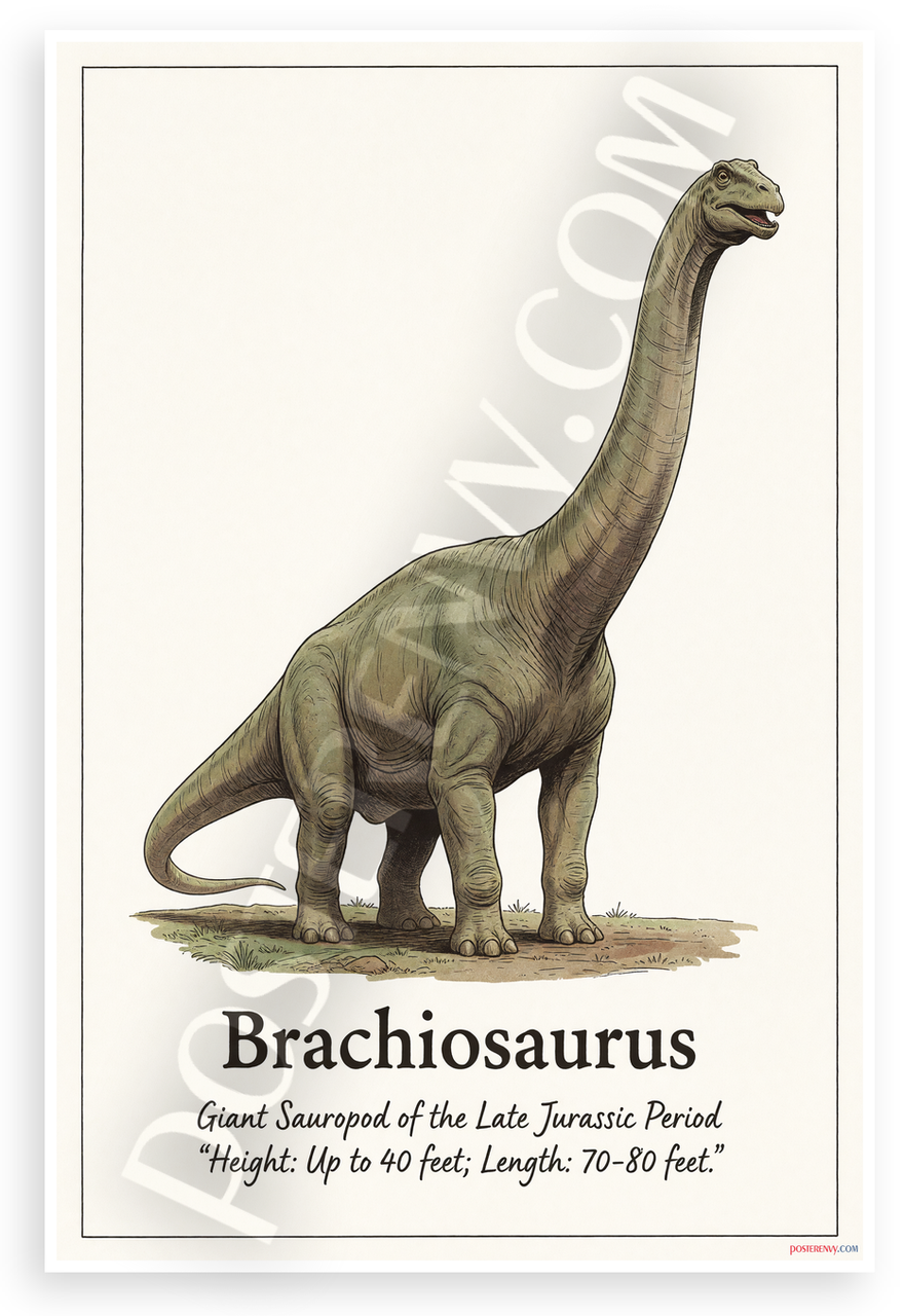 - Detailed Dinosaur Illustration: Vintage-style rendering of towering Brachiosaurus in earthy tones against simple ground, informative text on height and length. Creates curious mood for classrooms, kids rooms, or science spaces