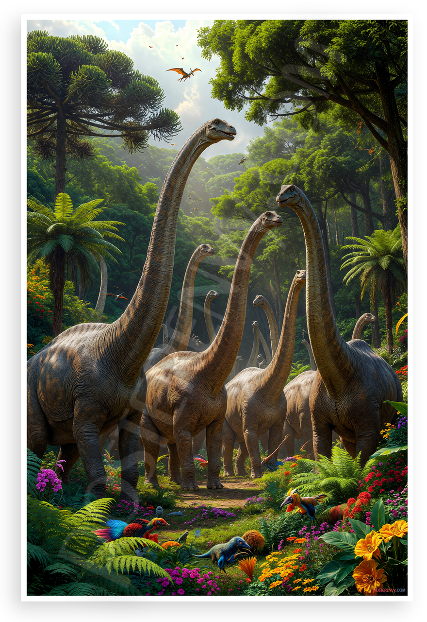 This 12x18 inch poster is printed on premium, durable paper. Proudly Made in the USA by PosterEnvy. The perfect size for any room. PosterEnvy is a family owned business, delivering top-notch posters around the world for over 20 years. Our posters are designed to last — they won't fade or pucker for years of enjoyment. Every poster features crisp, vivid artwork. We are a solar powered company. This whimsical poster depicts a playful herd of Brachiosaurus dinosaurs reaching for leaves amid lush green ferns, colorful flowers, pterodactyls in flight, and vibrant prehistoric jungle foliage under a sunny sky.