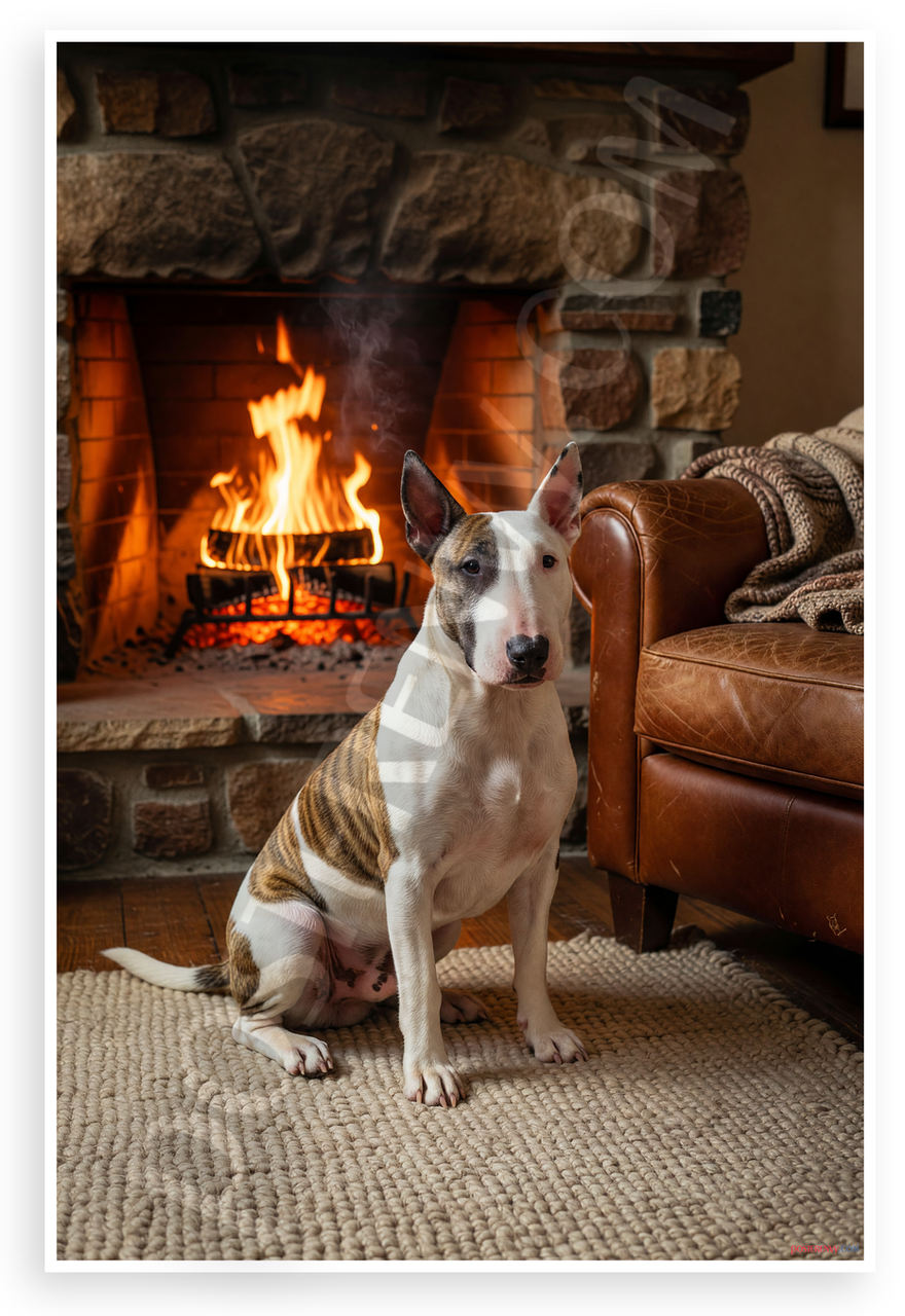 - Cozy Living Room Scene: Photorealistic Bull Terrier sits poised before stone fireplace flames, leather chair, soft blanket and rug create relaxing mood. Perfect for family rooms, dens, or pet lover spaces
