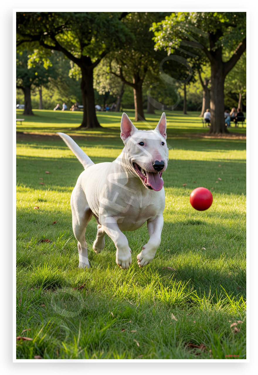 This 12x18 inch poster is printed on premium, durable paper. Proudly Made in the USA by PosterEnvy. The perfect size for any room. PosterEnvy is a family owned business, delivering top-notch posters around the world for over 20 years. Our posters are designed to last — they won't fade or pucker for years of enjoyment. Every poster features crisp, vivid artwork. We are a solar powered company. This vibrant poster captures a playful white Bull Terrier joyfully chasing a red ball across lush green grass in a sunny park, surrounded by trees and distant people. The energetic motion and happy expression convey pure dog fun and outdoor adventure.