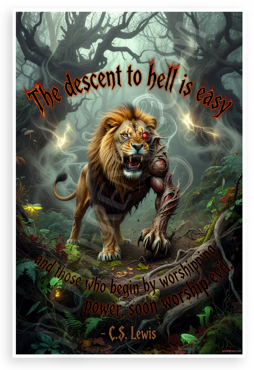 This 12x18 inch poster is printed on premium, durable paper. Proudly Made in the USA by PosterEnvy. The perfect size for any room. PosterEnvy is a family owned business, delivering top-notch posters around the world for over 20 years. Our posters are designed to last — they won't fade or pucker for years of enjoyment. Every poster features crisp, vivid artwork. We are a solar powered company. This haunting fantasy poster depicts a majestic lion morphing into a feral beast amid misty enchanted forest shadows, symbolizing the dangers of power's corruption. The full C.S. Lewis quote adds profound moral depth.