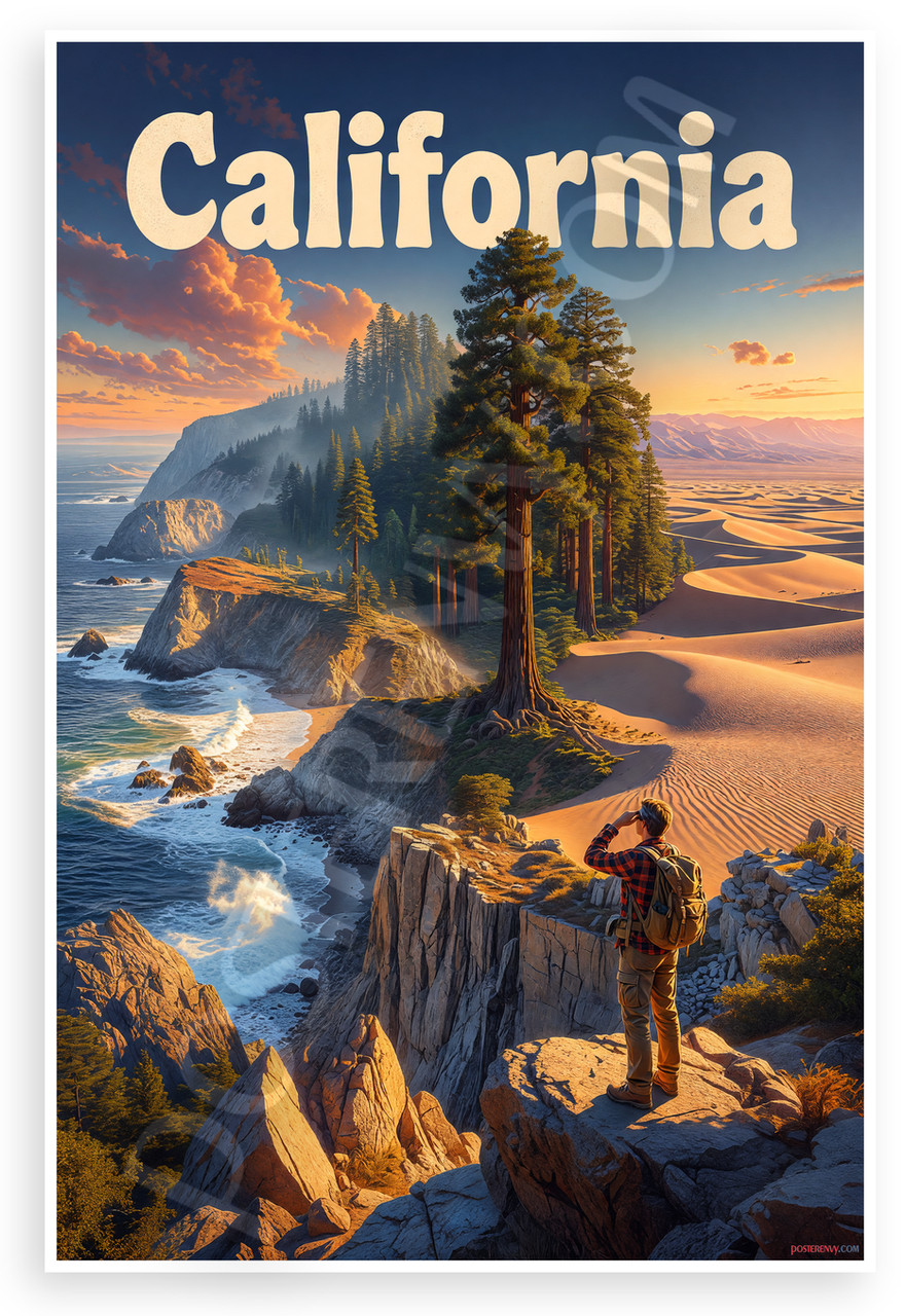 This 12x18 inch poster is printed on premium, durable paper. Proudly Made in the USA by PosterEnvy. The perfect size for any room. PosterEnvy is a family owned business, delivering top-notch posters around the world for over 20 years. Our posters are designed to last — they won't fade or pucker for years of enjoyment. Every poster features crisp, vivid artwork. We are a solar powered company. This stunning artwork captures California's dramatic coastline with rugged cliffs, towering pine trees, ocean waves, sandy dunes, and a vibrant sunset sky. A hiker stands overlooking the epic scene, evoking adventure and natural beauty.