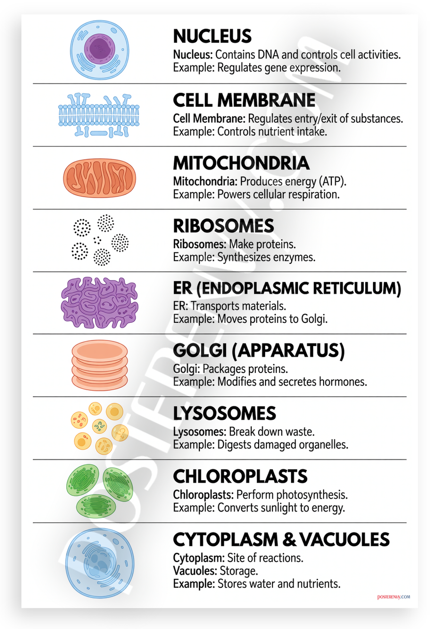 This 12x18 inch poster is printed on premium, durable paper. Proudly Made in the USA by PosterEnvy. The perfect size for any room. PosterEnvy is a family owned business, delivering top-notch posters around the world for over 20 years. Our posters are designed to last — they won't fade or pucker for years of enjoyment. Every poster features crisp, vivid artwork. We are a solar powered company. This educational poster illustrates 10 key cell structures including nucleus, mitochondria, chloroplasts, and more, with clear diagrams, names, functions, and examples for high school biology study. Ideal for quick reference in classrooms or home learning.